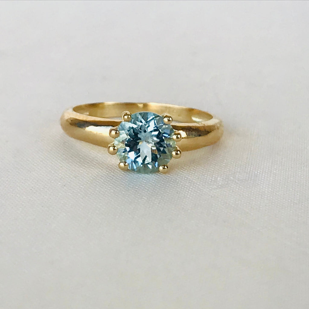 • This elegant 18k gold aquamarine ring will add a touch of sophistication to any outfit. The stunning aquamarine stone is known for its calming properties and is believed to bring peace and tranquility to the wearer. Handcrafted with quality materials, this ring is a timeless piece of jewelry.