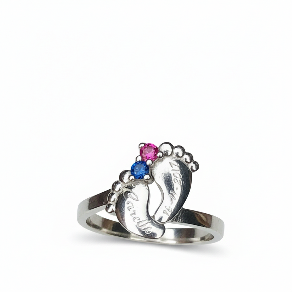• This delicate ring features a charming design of baby feet adorned with sparkling birthstones. Crafted in gold, it is a beautiful way to commemorate the birth of a new family member or a special little one. With a personalized touch, it makes for a thoughtful and meaningful gift.