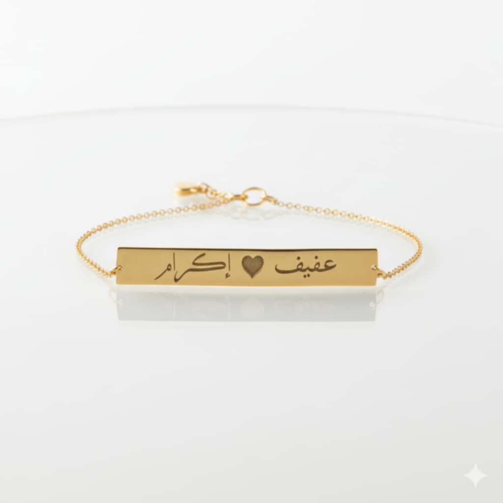 •This 18k gold engraved plaque adds a personalized touch to any bracelet. Show off your unique style with a custom message or symbol, made to last in high quality materials. Perfect for a special occasion or as a statement piece.