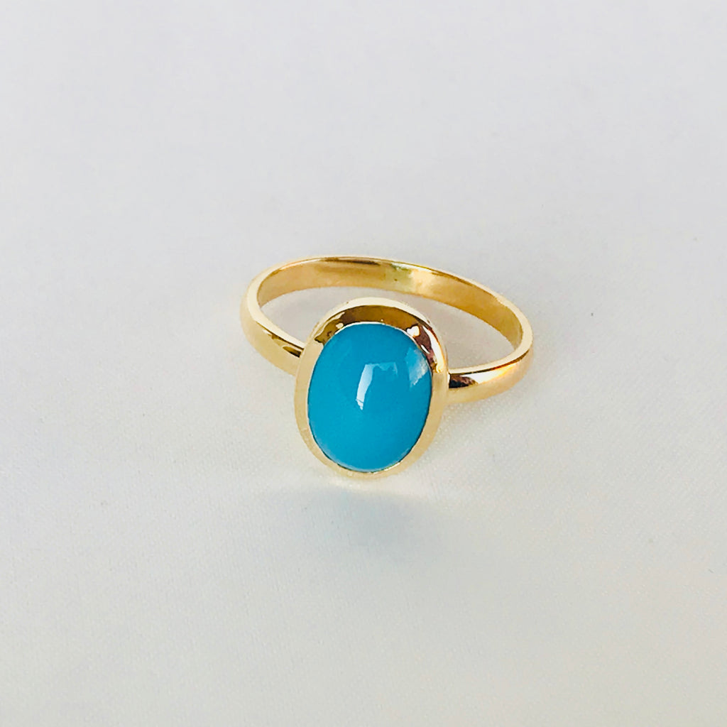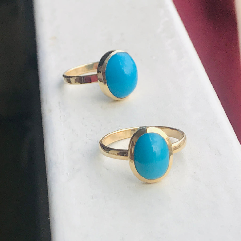 • This stunning Oval Turquoise Ring boasts a sleek 18k gold band and a mesmerizing turquoise stone. The unique oval shape adds a touch of elegance to the rich blue color, creating a perfect blend of sophistication and style. Enhance any outfit with this luxurious and eye-catching piece.